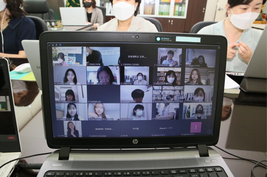 건양대 간호학과 재학생 9명과 교수 5명, 쿠루메대 간호학과 재학생 9명과 교수 5명이 참여한 이날 토론회에서는 학생들이 자국의 코로나 감염상황과 코로나 유행 상황에서의 대학생활에 대한 PT자료를 상대국가 언어로 작성 및 발표했다.