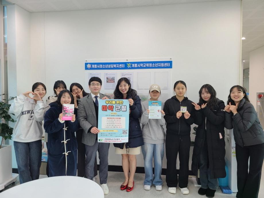 지역사회 청소년들에게 마약예방 내용을 담아 제작한 포스터, 팜플렛, 홍보물품을 전달하였고 전달물품 중에 ‘마약사건 일타검사’출신 김희준 변호사가 출간한 ‘청소년 마약에 관한 모든 질문’이라는 도서를 센터에 있는 청소년들이 읽을 수 있도록 기증하였다.