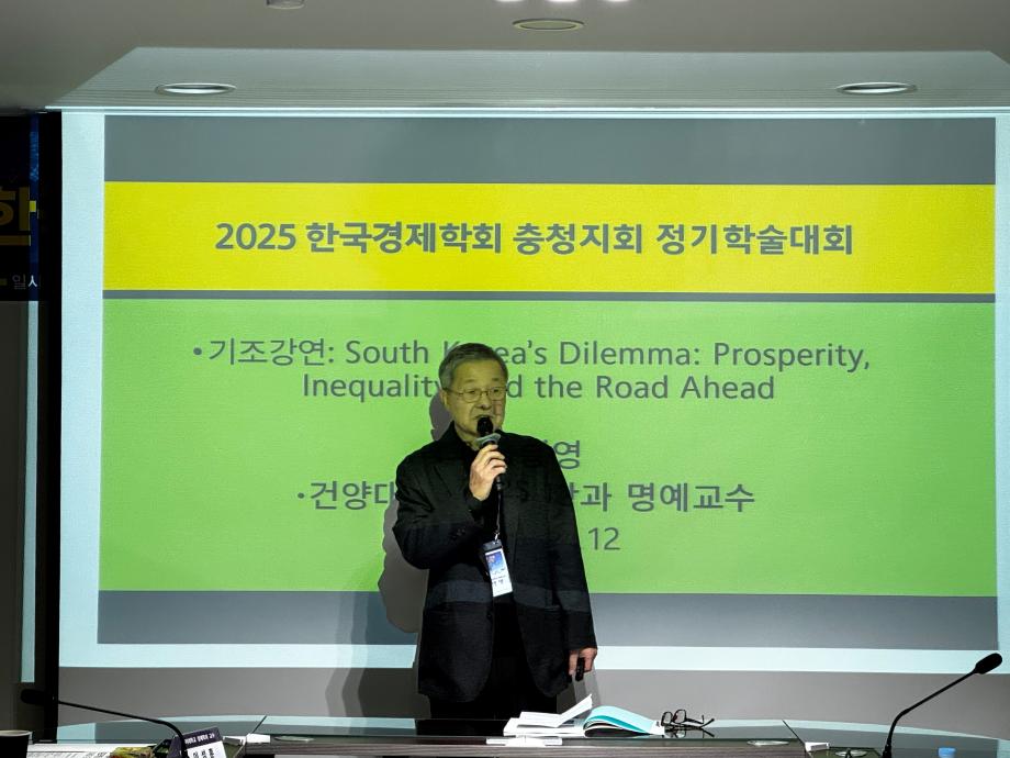 건양대학교(총장 김용하) 금융학세무학부(학부장 최정희) 배세영 명예교수가 지난 12일 충북연구원 대회실에서 개최된 2025년 한국경제학회 충청지회 정기학술대회에서 20여 명의 참석자들이 자리한 가운데 기조강연을 진행하며 한국 경제와 사회의 현주소에 대한 심도 있는 논의를 펼쳤다.