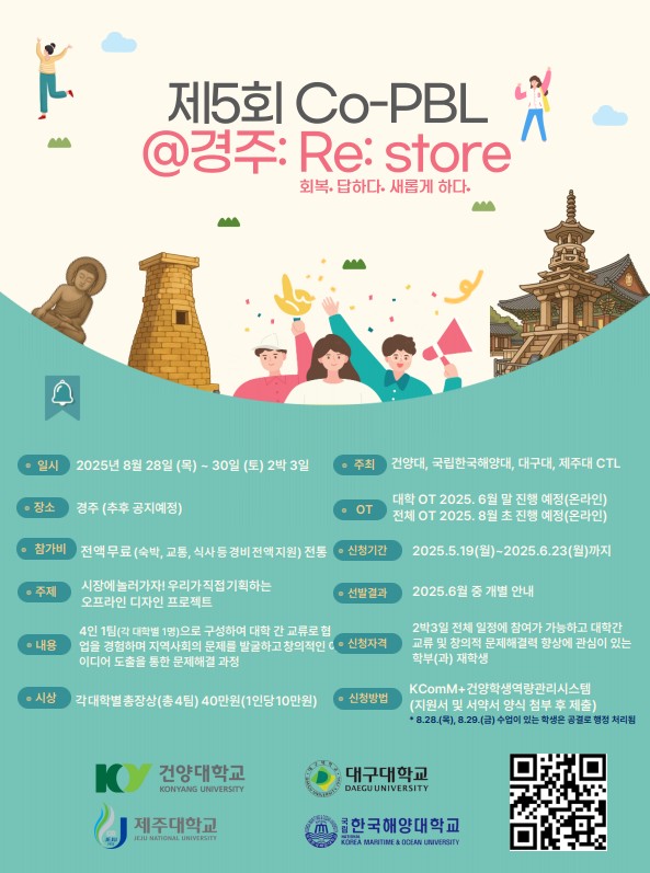 안녕하세요. 임상의약학과 행정실입니다. 대학 간 교류 활동 지원과 창의적 문제해결력 향상을 위한 "제5회 권역 연합 CTL 공동 프로그램「Co-PBL@경주」" 참여 학생을 모집합니다. 이에 정보 공유 차원으로 안내 드립니다. 가. 모집내용 : 제5회 권역 연합 CTL 공동 프로그램 「Co-PBL@경주」 참여 학생 - 건양대, 국립한국해양대, 대구대, 제주대 연합으로 운영하는 프로그램으로 지역사회 문제점 및 창의적인 아이디어 도출을 통한 문제해결 워크숍 나. 운영기간 : 2025.8.28.(목)~8.30.(토), 2박3일 / 경주 지역 다. 선발인원 : 학부(과) 재학생 총 16명 라. 신청기간 : 2025.5.19.(월)~6.23.(월) 마. 신청방법 : 건양학생역량관리시스템(KComM+) https://vo.la/XWYWpca 바. 참여혜택 : 각 대학별 총장상(4팀) 시상금 40만원, 참가비 무료, 비교과 실적 반영 사. 기타사항 : 8.28(목), 8.29(금) 수업이 있는 학생은 공결 행정 처리